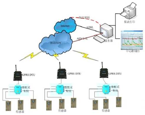通过RS—485总线将数字传感器(也可采用模拟输出传感器)与ACX32.00连为一体,构成现场监控单元。GPRS DTU无线测控终端内置:CPU模块、数据存储模块、控制模块、GPRS/CDMA数据通信模块。可将经过触摸屏转发的数据经RS485接入GPRS DTU,然后直接通过GPRS无线模块将现场数据与远程控制中心连接,将采集数据实时发送到远程数据库服务器,并存储到数据库中。通过该系统,即使在远离观测现场的异地,也能方便地对各种环境要素如流量、压力等数据的采集读取,真正实现了远程监测和数据共享的功能。